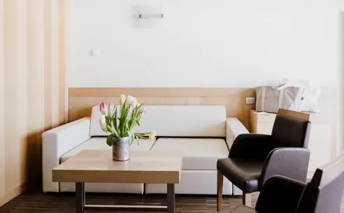 Dubbelrum på 28 kvm. med en stor dubbelsäng, soffa och balkong. Eget badrum med dusch och toalett. Det är möjligt att addera två extrabäddar i rummet.